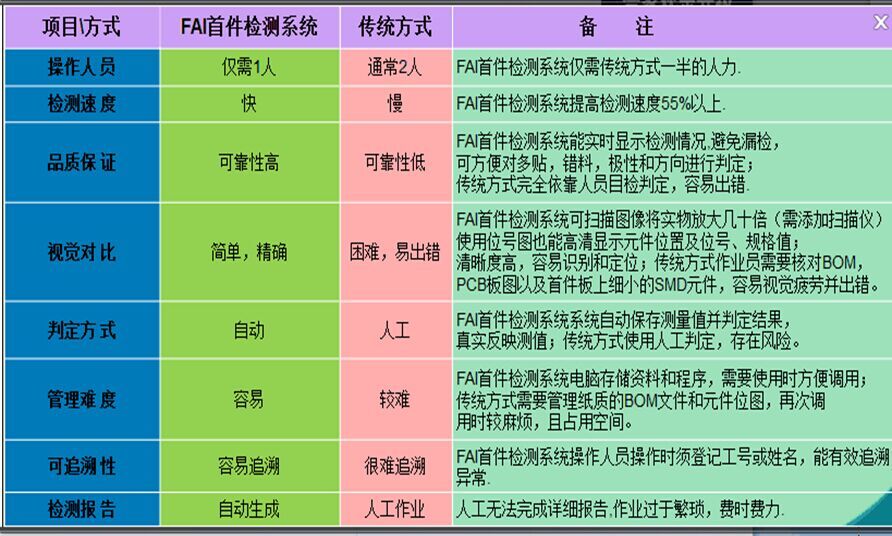 隨著電子產業的蓬勃發展,今天,中國已經成為世界的工廠。電子制造企業的生產效率,品質控制和成本高低決定著企業的競爭力,也決定著企業贏得客戶訂單的能力。電子產品的高度集成化,貼片元件的尺寸及PCBA板的密度達到了前所未有的程度,產品更新換代的速度也越來越快,多機種,小批量,頻繁換線越來越挑戰工廠的制造能力。高速貼片機等設備提升了工廠的生產能力,但是在SMT首件確認環節,大多數工廠卻依然停留在非常落后的人工確認階段。首件確認已經成為SMT生產的瓶頸!目前SMT首件確認通常為兩個作業員配合操作,人工對照紙質BOM清單,CAD位置圖和首件板,同時還要進行元件的量測,誤差計算、對錯判斷和記錄等工作。整個過程耗時較長,導致貼片機使用效率降低,甚至造成停線等待。首件確認環節也過多地占用了人力成本,導致工廠成本上升。另外人工確認缺乏有效的管控,不可避免的人為失誤加大了首件檢測的風險,可能造成產品批量返工。針對此難題,深圳華普通用科技有限公司聯合美國陽升測試設備有限公司,成功推出了SMT智能首件檢測系統FAI-520,在實現品質提升的同時,還可以減少一半人員,提高一倍效率!